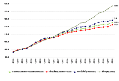 สำหรับในไตรมาส 3 ปี 2560 ภาพรวมดัชนีราคาห้องชุดใหม่ในตลาด ในกรุงเทพฯ – ปริมณฑล มีค่าดัชนีเท่ากับ 128.8 จุด โดยเพิ่มขึ้นจาก121.6 จุด หรือ 5.9% และปรับเพิ่มขึ้นจากไตรมาส 2 ปี 2560 โดยเพิ่มขึ้นจาก 126.8 จุด หรือ 1.6 %