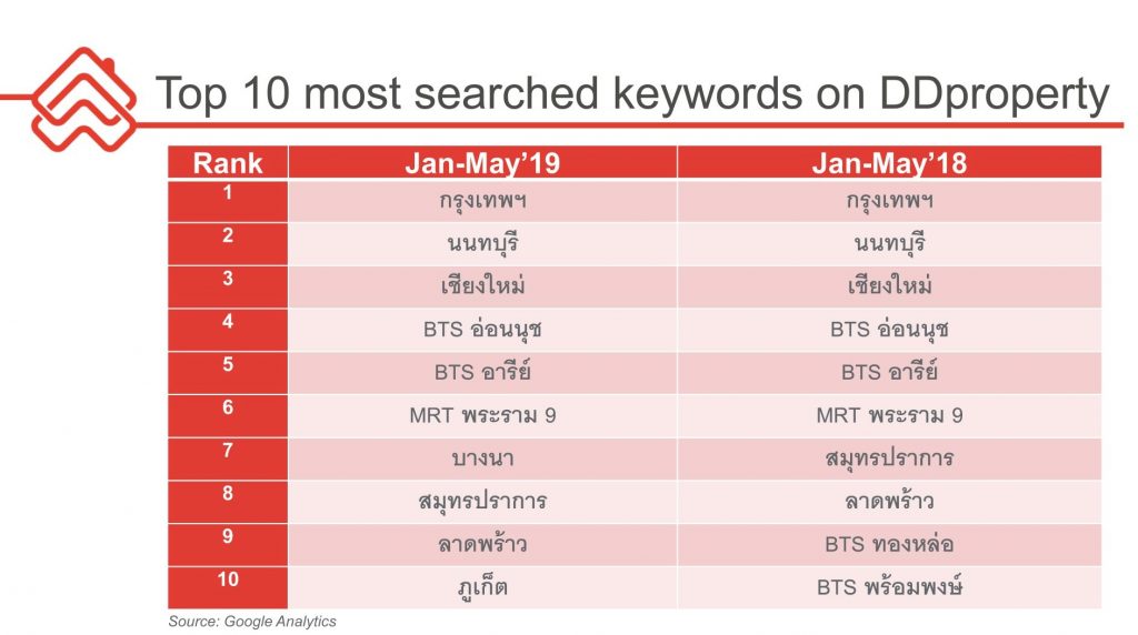 นอกจากนี้ ข้อมูลการค้นหาอสังหาฯ ในเว็บไซต์ของ DDproperty พบว่าคำค้นตามพื้นที่ที่เป็นที่นิยมมากที่สุด 3 อันดับแรกใน 5 เดือนแรกของปีนี้คือ กรุงเทพฯ นนทบุรี และเชียงใหม่ ซึ่งยังคงเหมือนกับข้อมูล 3 อันดับแรกของปีก่อน นอกจากนี้ข้อมูลจาก 8 ใน 10 อันดับแรกเป็นคำค้นสำหรับพื้นที่ในกรุงเทพฯ และปริมณฑล สะท้อนให้เห็นความต้องอสังหาฯ ในกรุงเทพฯ และปริมณฑลมากกว่าพื้นที่อื่นในประเทศ