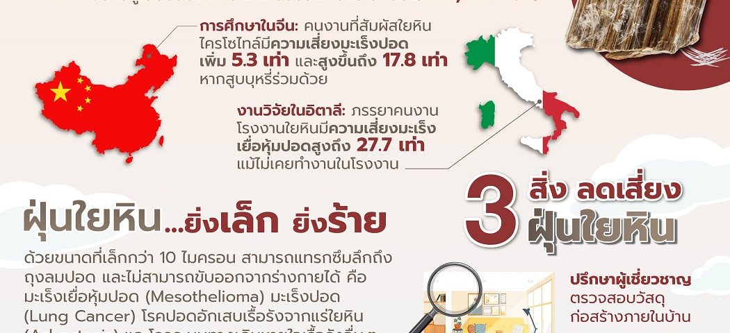 • การศึกษาในจีน: คนงานที่สัมผัสใยหินไครโซไทล์มีความเสี่ยง มะเร็งปอดเพิ่ม 3 เท่า และสูงขึ้นถึง 17.8 เท่า หากสูบบุหรี่ร่วมด้วย