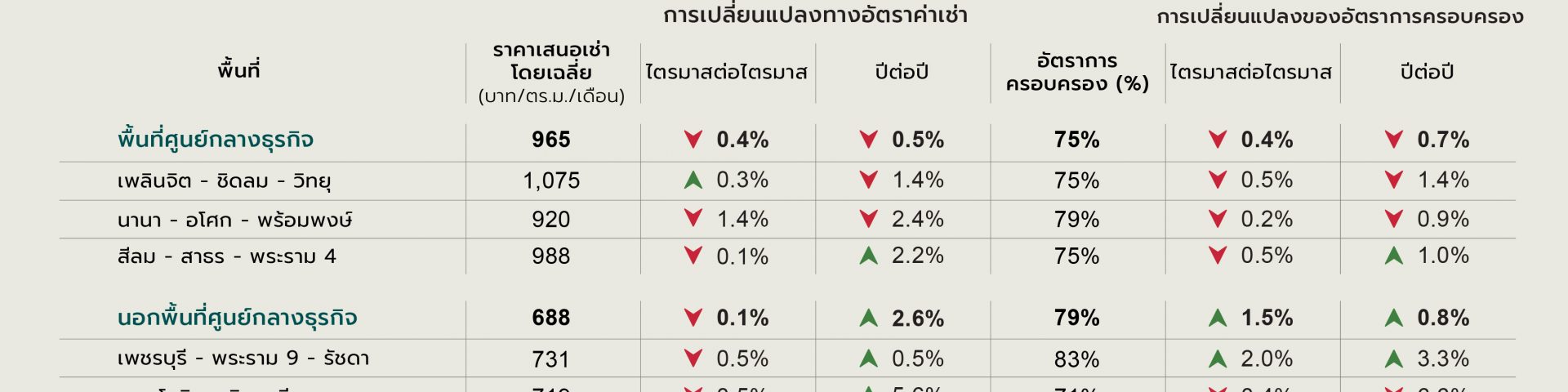 ในทางกลับกัน กลุ่มทำเล CBD หลัก เช่น เพลินจิต–ชิดลม–วิทยุ และสีลม–สาทร–พระราม 4 มีอัตราการเช่าปรับลดลงเล็กน้อย