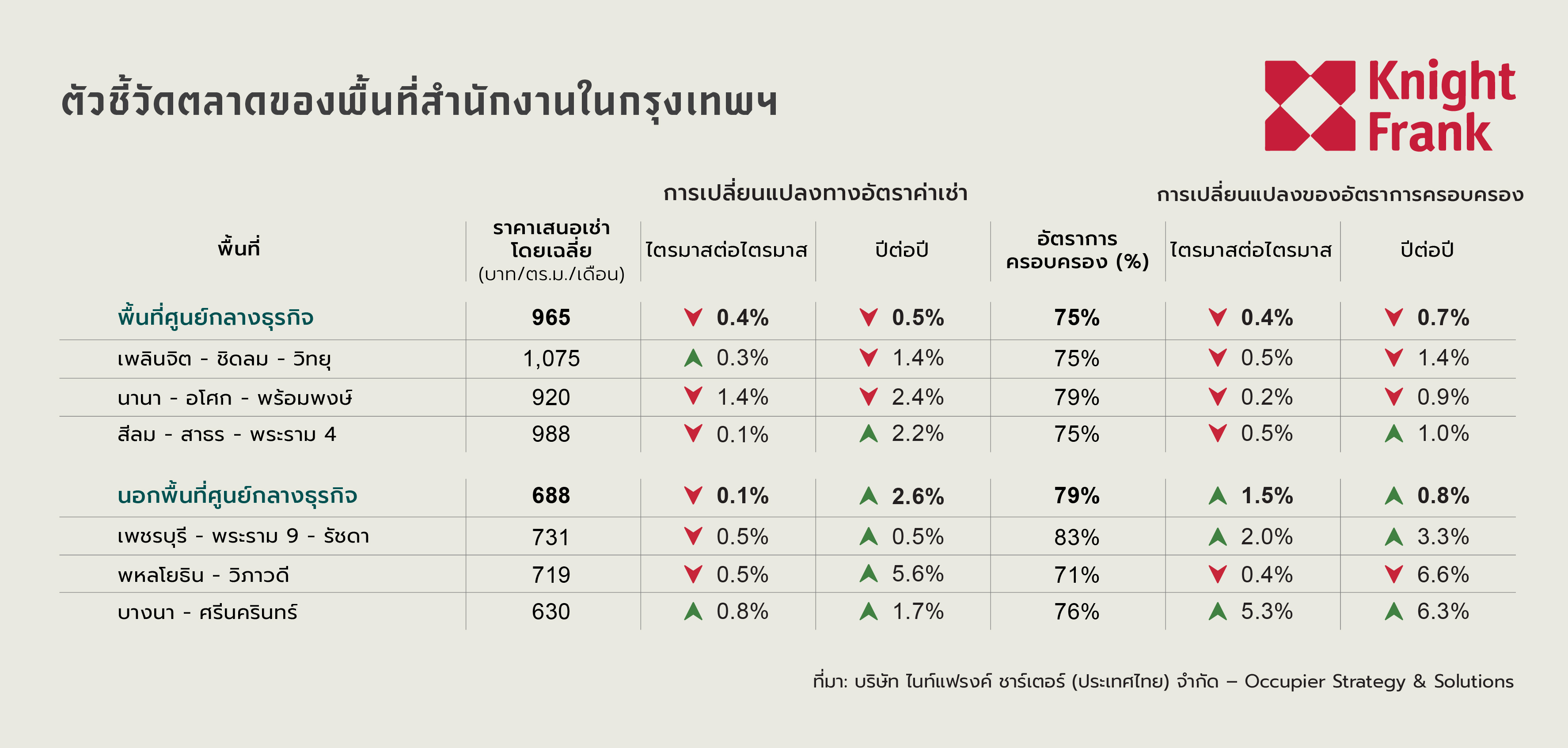 อัตราการเช่าพื้นที่ในทำเลนอก CBD ปรับเพิ่มขึ้นสู่ระดับ 79% เพิ่มขึ้น 1.5 จุดเปอร์เซ็นต์จากไตรมาสก่อนหน้า ในขณะที่อัตราการเช่าใน CBD ลดลงมาอยู่ที่ 75% หดตัวลง 0.4 จุดเปอร์เซ็นต์ในช่วงเวลาเดียวกัน