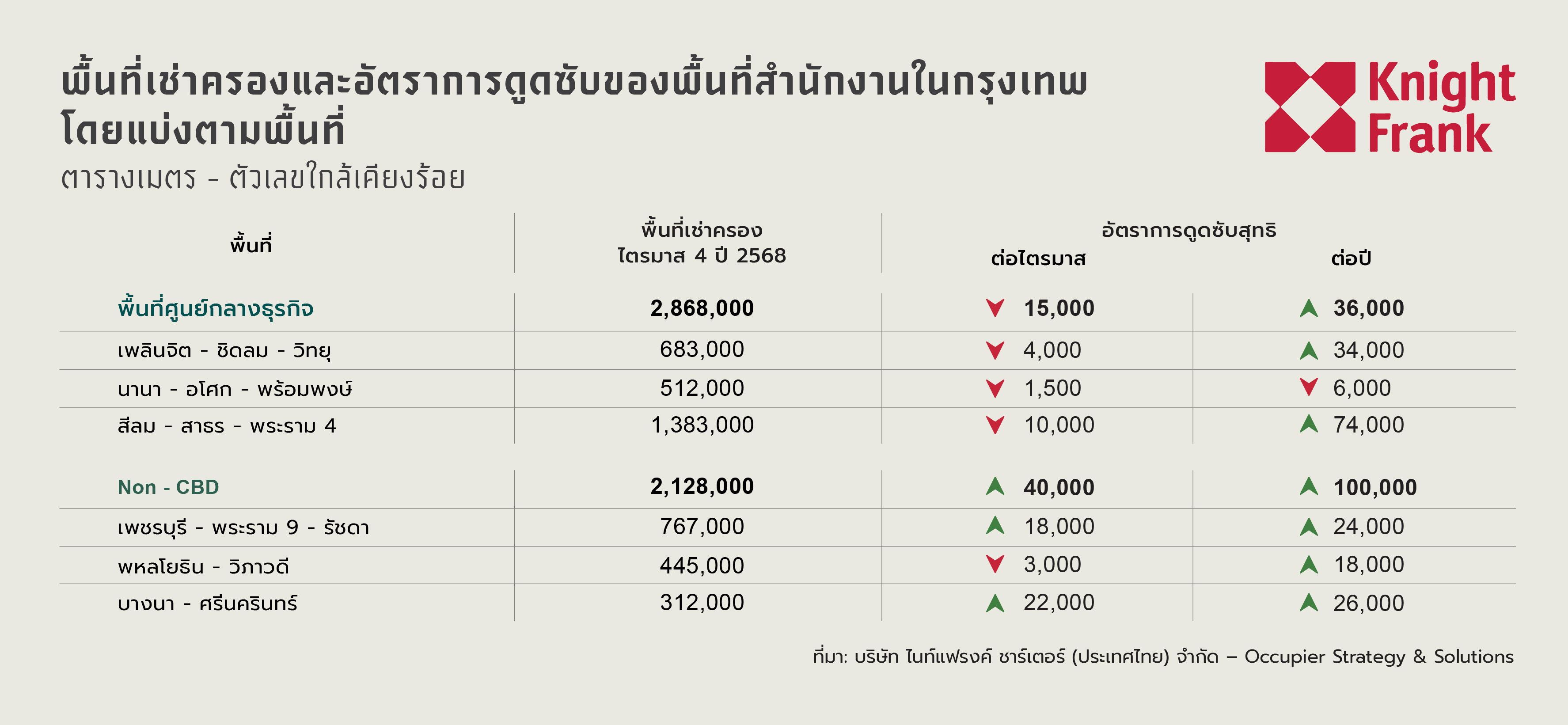 ตลาดสำนักงานกรุงเทพฯ ในไตรมาส 4 ปี 2568 แสดงสัญญาณชัดเจนของการปรับสมดุลเชิงภูมิศาสตร์ โดยทำเลนอกศูนย์กลางธุรกิจ (Non-CBD) มีผลการดำเนินงานเหนือกว่าพื้นที่ CBD แบบดั้งเดิม