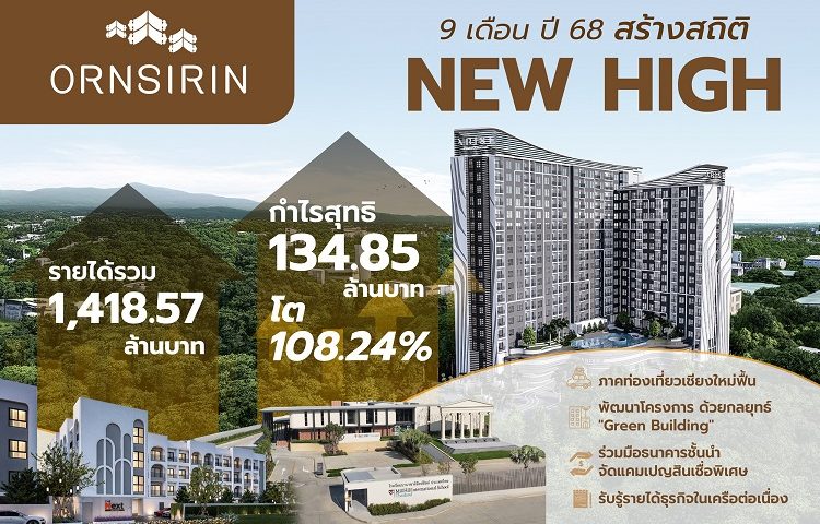 ORN เผยงบงวด 9 เดือนปี 2568 ทุบสถิติทำ New High กวาดรายได้รวม 1,418.57 ล้านบาท โต 72.95% กำไรสุทธิ 134.85 ล้านบาท พุ่ง 108.24% ขณะที่ ผลประกอบการไตรมาส 3 ปี 2568 รายได้รวม 616.94 ล้านบาท กำไรสุทธิ 71.16 ล้านบาท ชี้แรงหนุนตลาดอสังหาฯ เชียงใหม่คึกคัก ยอดโอนคอนโดฯ บ้านแนวราบพุ่ง พร้อมรับรู้ค่าเทอม ค่าแรกเข้า จากธุรกิจบริษัทย่อย โรงเรียนนานาชาติ Mill Hill International School Thailand มองโอกาสธุรกิจสร้างรายได้มั่นคงเพิ่ม เสริมแกร่งกลุ่มธุรกิจ
