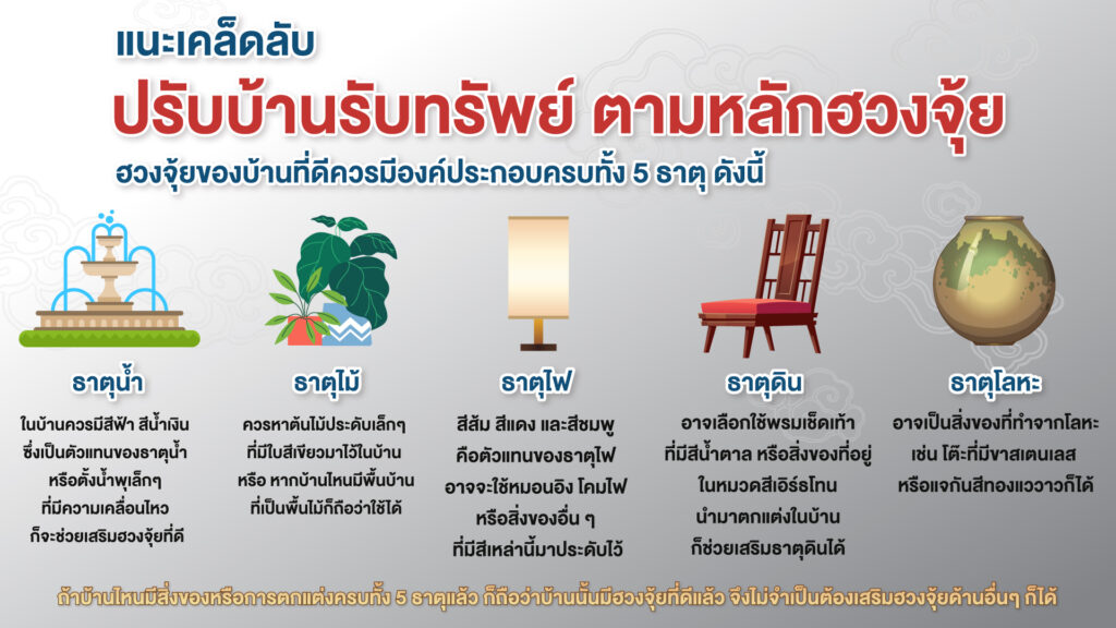 ฮวงจุ้ยของบ้านที่ดีควรมีองค์ประกอบครบทั้ง 5 ธาตุ ดังนี้
