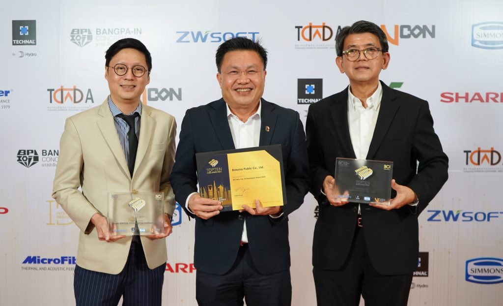 ตอกย้ำความสำเร็จ – นายธีรเดช เกิดสำอางค์ (กลาง) ประธานเจ้าหน้าที่บริหาร บริษัท บริทาเนีย จำกัด (มหาชน) หรือ BRI และ นายกฤษณ์ เตชะสัมมา (ซ้าย) ประธานเจ้าหน้าที่สายงานการตลาด บริษัท ออริจิ้น เวอร์ติเคิล คอร์ปอเรชั่น รับรางวัล “BCI Asia Top 10 Developers Awards 2024” จากการคัดเลือกให้เป็น 1 ใน 10 บริษัทพัฒนาอสังหาริมทรัพย์ดีเด่นของประเทศไทย ในงาน “BCI Asia Awards 2024” รางวัลจากผลงานออกแบบโครงการที่โดดเด่นทั้งในเรื่องของการออกแบบ คุณภาพ และคำนึงถึงผลกระทบต่อสิ่งแวดล้อม ทั้งคอนโดมิเนียมและบ้านจัดสรร