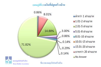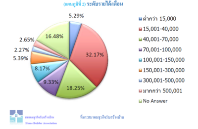 สำหรับวงเงินที่ผู้บริโภคต้องการขอสินเชื่อจากสถาบันการเงินนั้น ส่วนใหญ่อยู่ประมาณ 2.0-5 ล้านบาท (ดูกราฟแผนภูมิที่ 1 ) ระดับรายได้ต่อเดือนอยู่ที่ 15,001-40,000 บาท คิดเป็นสัดส่วน 32.17% รองลงมาระดับรายได้ต่อเดือนอยู่ที่ 40,001-70,000 บาท และอันดับสามระดับรายได้อยู่ที่ 70,001-100,000 บาทต่อเดือน (ดูกราฟแผนภูมิที่2) โดยหากพิจารณาลึกไปในอาชีพแล้วจะพบว่าผู้ที่ต้องการปลูกสร้างบ้านบนที่ดินมีหลากหลายทั้งเป็นพนักงานบริษัทเอกชน ผู้ประกอบการเจ้าของธุรกิจ รับราชการ/รัฐวิสาหกิจ เป็นต้น