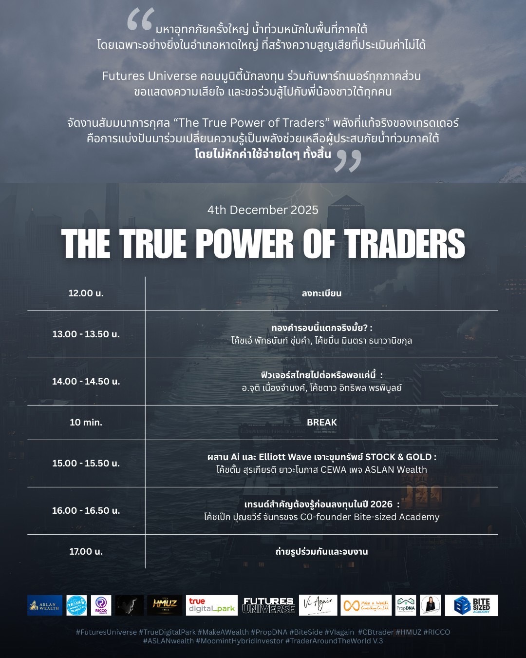 ทั้งนี้ Futures Universe ได้จัดงานสัมมนาการกุศลครั้งสำคัญ ภายใต้ชื่องาน “The True Power of Traders: พลังที่แท้จริงของเทรดเดอร์ คือการแบ่งปัน” เพื่อเปลี่ยนความรู้และประสบการณ์ด้านการลงทุนให้เป็นพลังแห่งการช่วยเหลือผู้ประสบภัยน้ำท่วมภาคใต้ โดยจะมอบเงินบริจาคทั้งหมด โดยไม่หักค่าใช้จ่ายใด ๆ ทั้งสิ้น