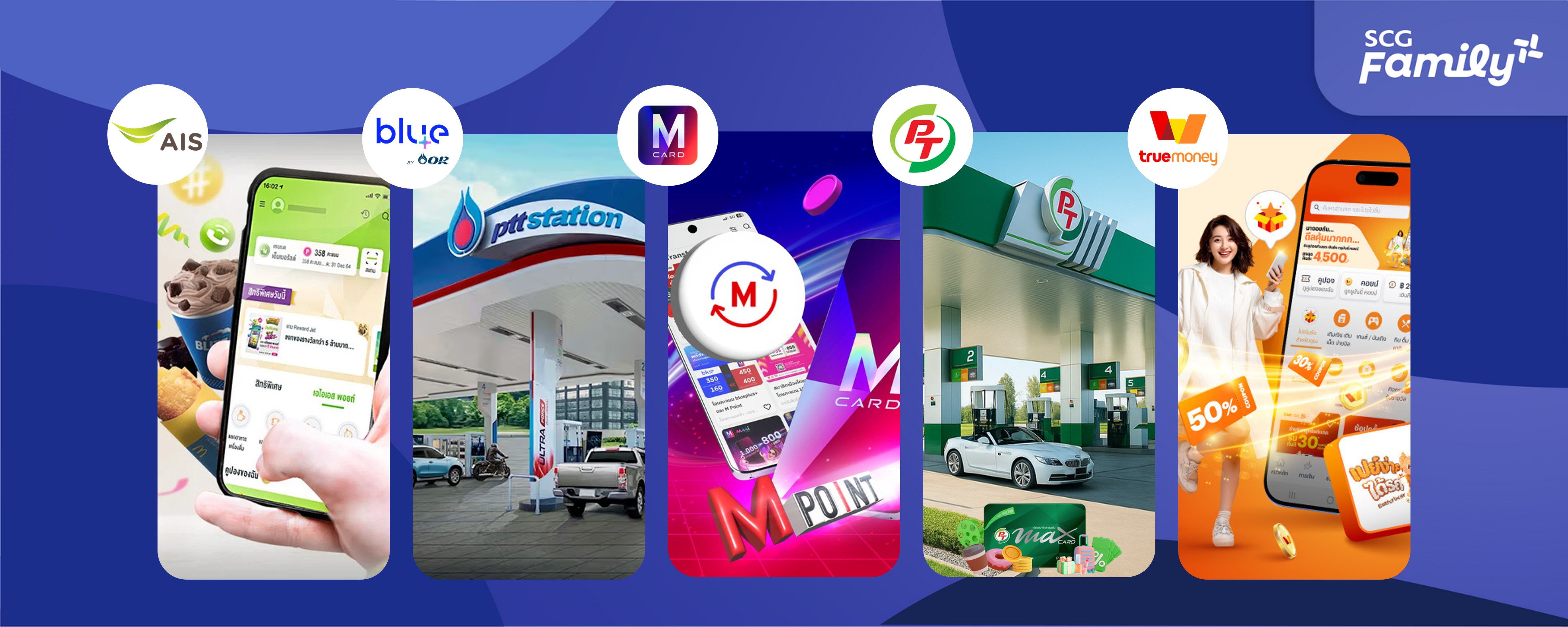 นอกจากนี้ SCG Family Plus+ ยังเป็นโปรแกรมที่เปิดกว้างสู่ความร่วมมือกับพันธมิตรแบรนด์ไทยชั้นนำ ได้แก่ AIS, blueplus+, The Mall Group, PTG และ TrueMoney เพื่อมอบสิทธิพิเศษที่หลากหลาย ครอบคลุมทั้งการเดินทาง ช้อปปิ้ง การสื่อสาร และพลังงาน