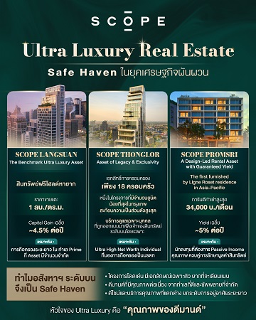 บริษัท สโคป จำกัด ในฐานะผู้พัฒนาอสังหาริมทรัพย์คุณภาพระดับ Ultra Luxury ชี้ให้เห็นว่า ในสภาวะเช่นนี้ การลงทุนที่มีคุณค่าไม่ใช่การมองหา “ราคาที่ถูกกว่า” แต่คือการเลือก สินทรัพย์ที่มีดีมานด์คุณภาพ มีตัวตน และสามารถยืนหยัด สร้างผลตอบแทนได้ในทุกวัฏจักรเศรษฐกิจ ด้วยเหตุนี้ อสังหาริมทรัพย์ระดับบน (Ultra Luxury Real Estate) จึงไม่ได้ถูกมองเพียงในฐานะที่อยู่อาศัย แต่เป็น สินทรัพย์หลบภัย (Safe Haven) ที่ตอบโจทย์ทั้งความมั่นคงในการถือครอง ศักยภาพการเติบโตของมูลค่าในระยะยาว และการสร้างกระแสรายได้ที่สามารถคาดการณ์ได้ ท่ามกลางความไม่แน่นอนของสินทรัพย์ทางการเงินประเภทอื่น