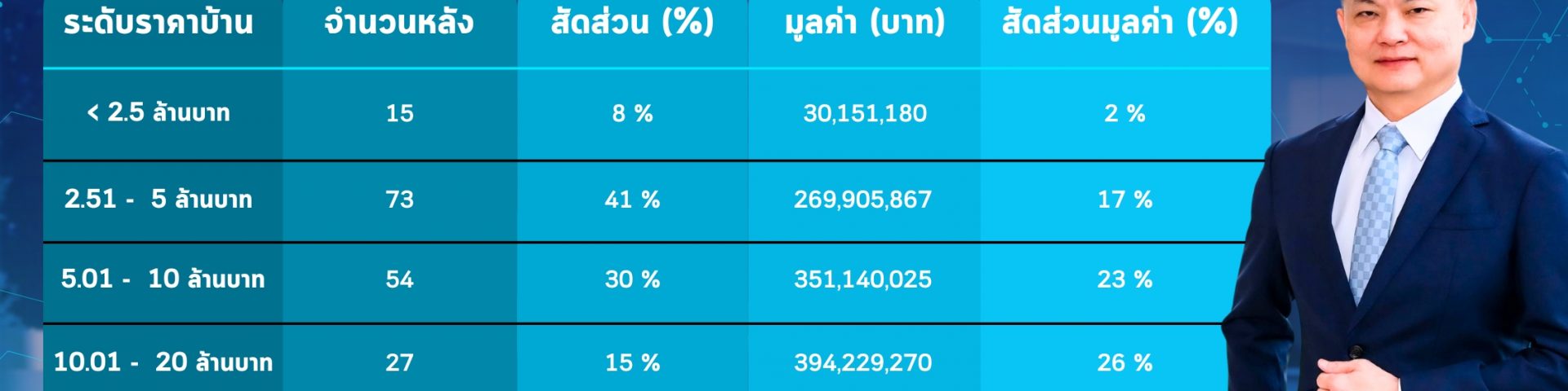 – บ้านราคา 20.01 ล้านบาทขึ้นไป จำนวน 11 หลัง คิดเป็น 6% มูลค่า 498,439,000 บาท